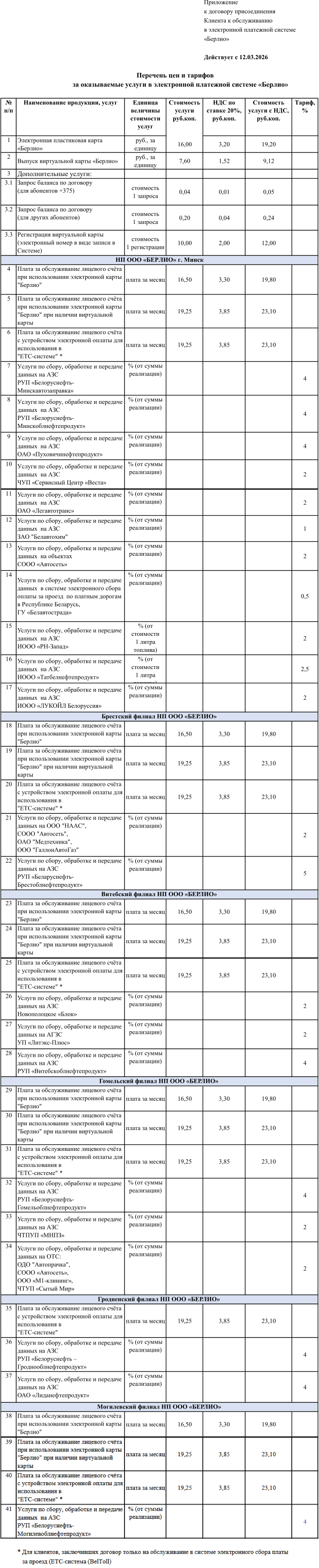 Перечень цен и тарифов за оказываемые услуги в электронной платежной системе «Берлио»